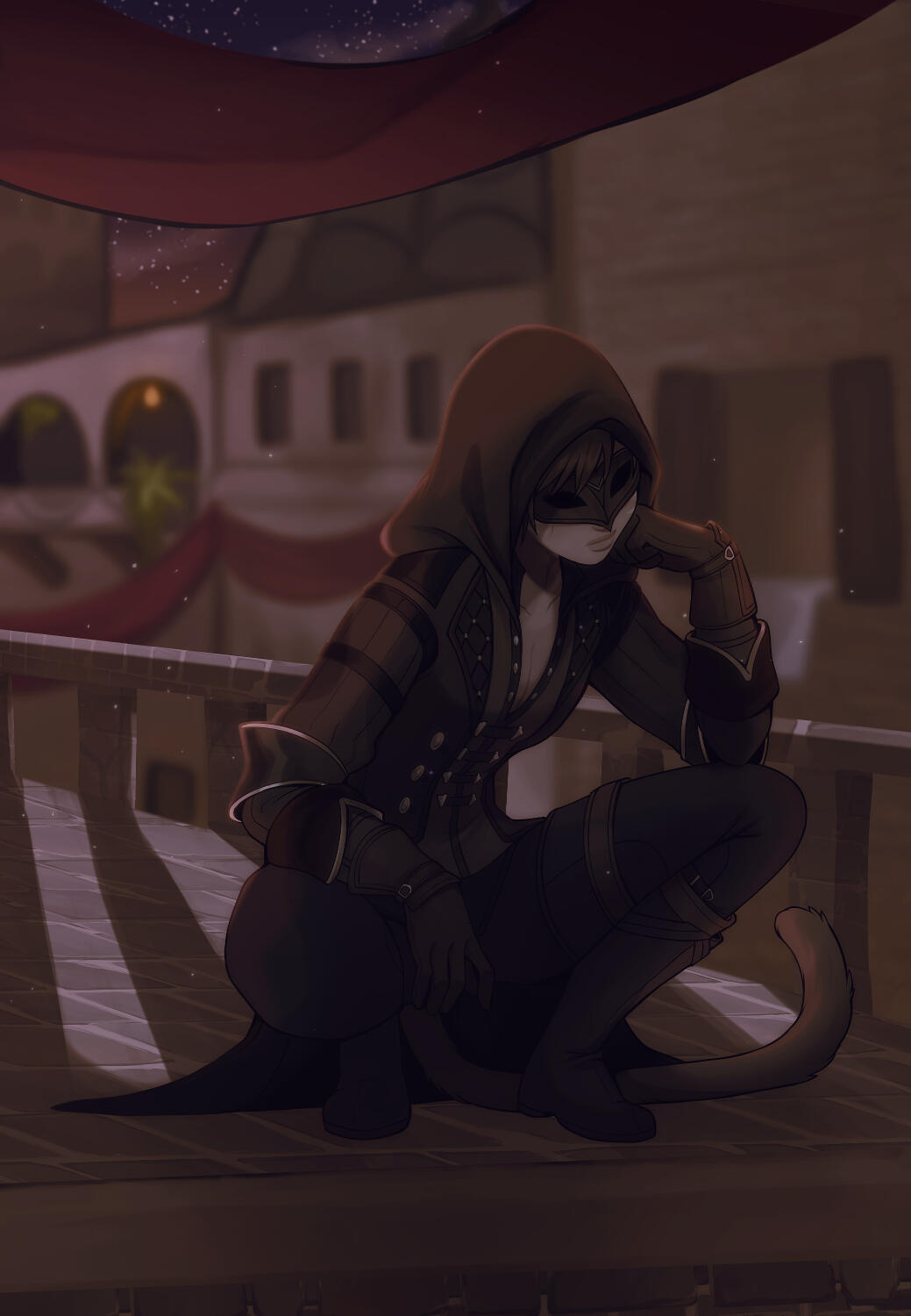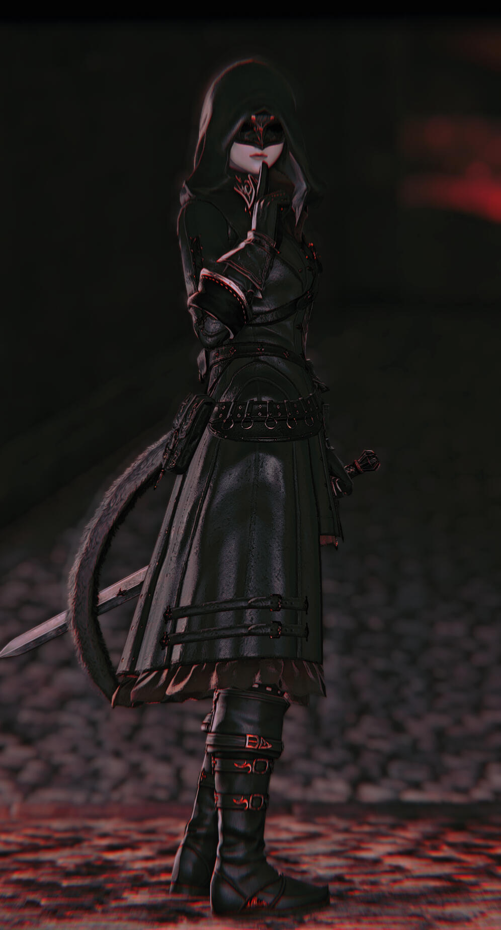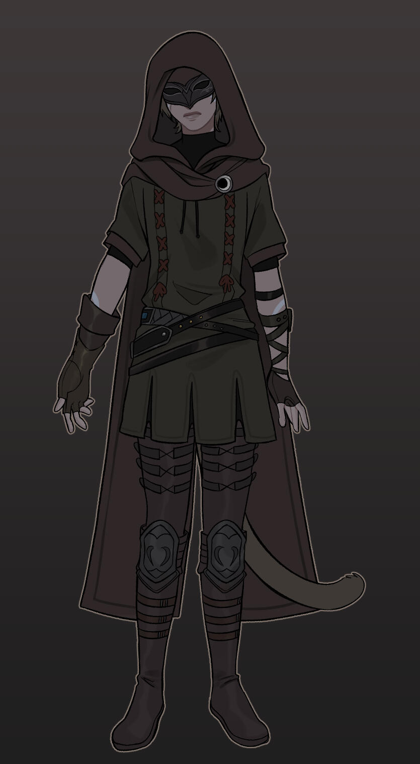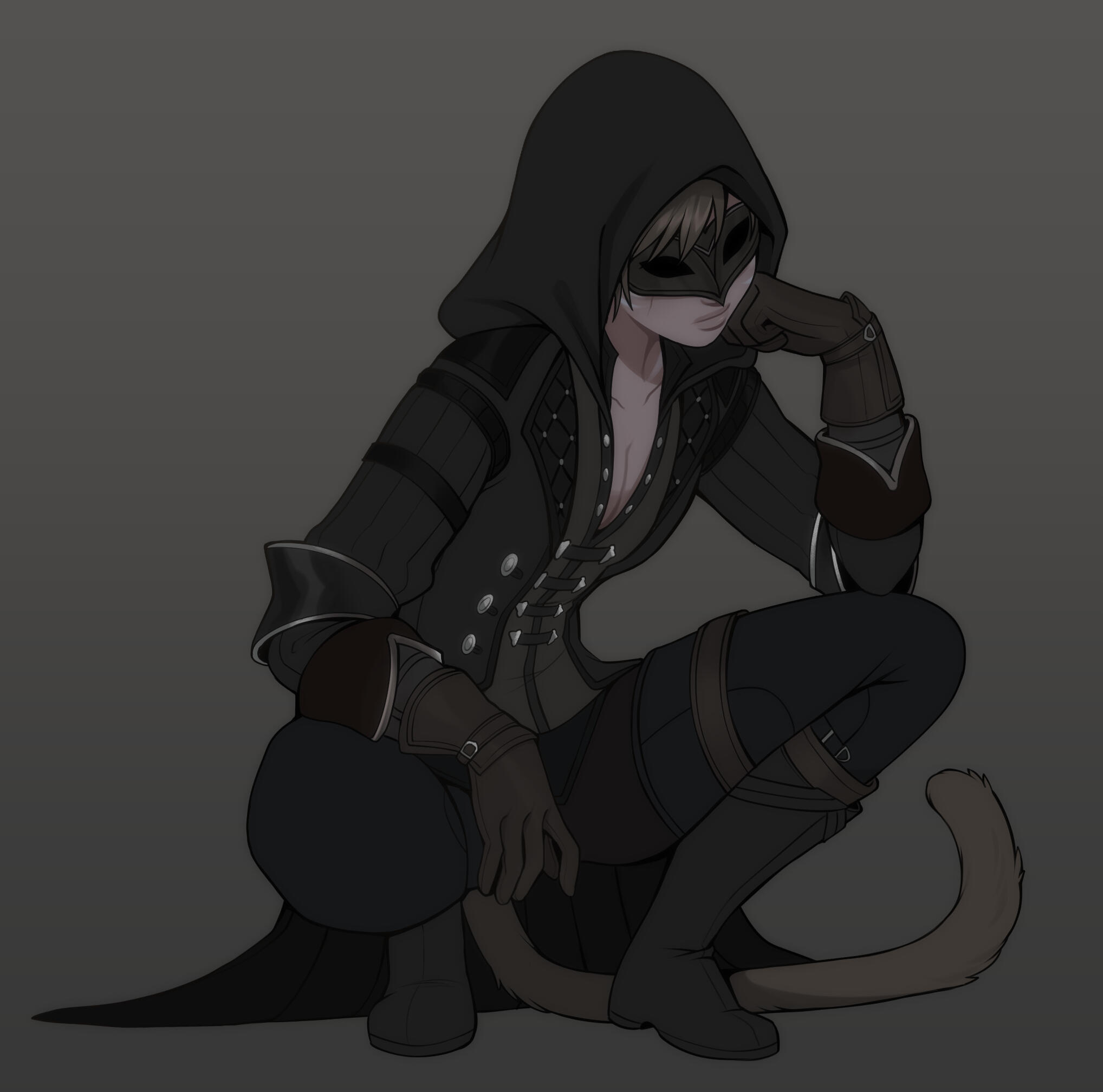 an unassuming presence even in an empty room. in fact, you may not even notice them there until it is too late; though too late for what? provided you are not a mark, simply a fright. if you are a mark, beware the flash of steel.of short stature and barely discernible gender, ghost wears dark clothing and is possessed of an equally dark personality. not cruel, no, but somber. muted and to themselves, beneath the hood that they oft don are a pair of wide gray eyes that watch and learn, and a mouth that does not speak unless necessary, either because they have nothing to say, or perhaps they have been trained to silence. regardless, their lips are tightly shut regarding most things, though one may find a curiosity hidden beneath their dark eyes, or in the flick of their tail, as if they want more.not many know their true name, and it may well have been stricken from all record. but people know of the ghost, this is to be certain. whether they have seen the ghost or not, they know it; a thief, an assassin, a spy - they can be whatever is needed of them, and they are so rarely caught. more rarely, they act as a devastatingly efficient voidsent hunter - when they have the time. they hail from the shroud, or so it has been told, but they can be found nearly anywhere there is work to be done.so, do you have something you need done?